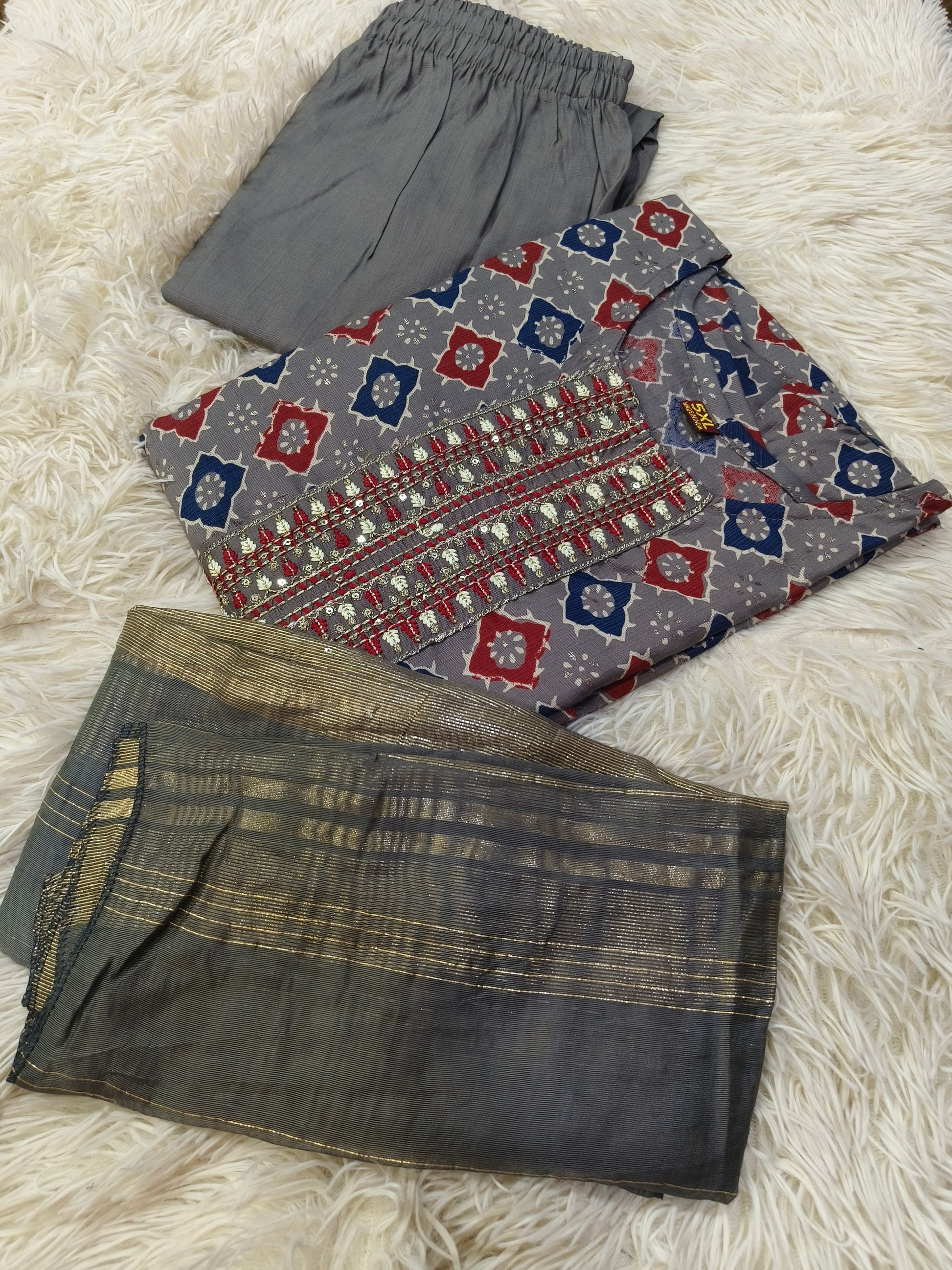 Vatican silk with Elegant designer 3pcs suits with floral printed design with beautiful neck work.