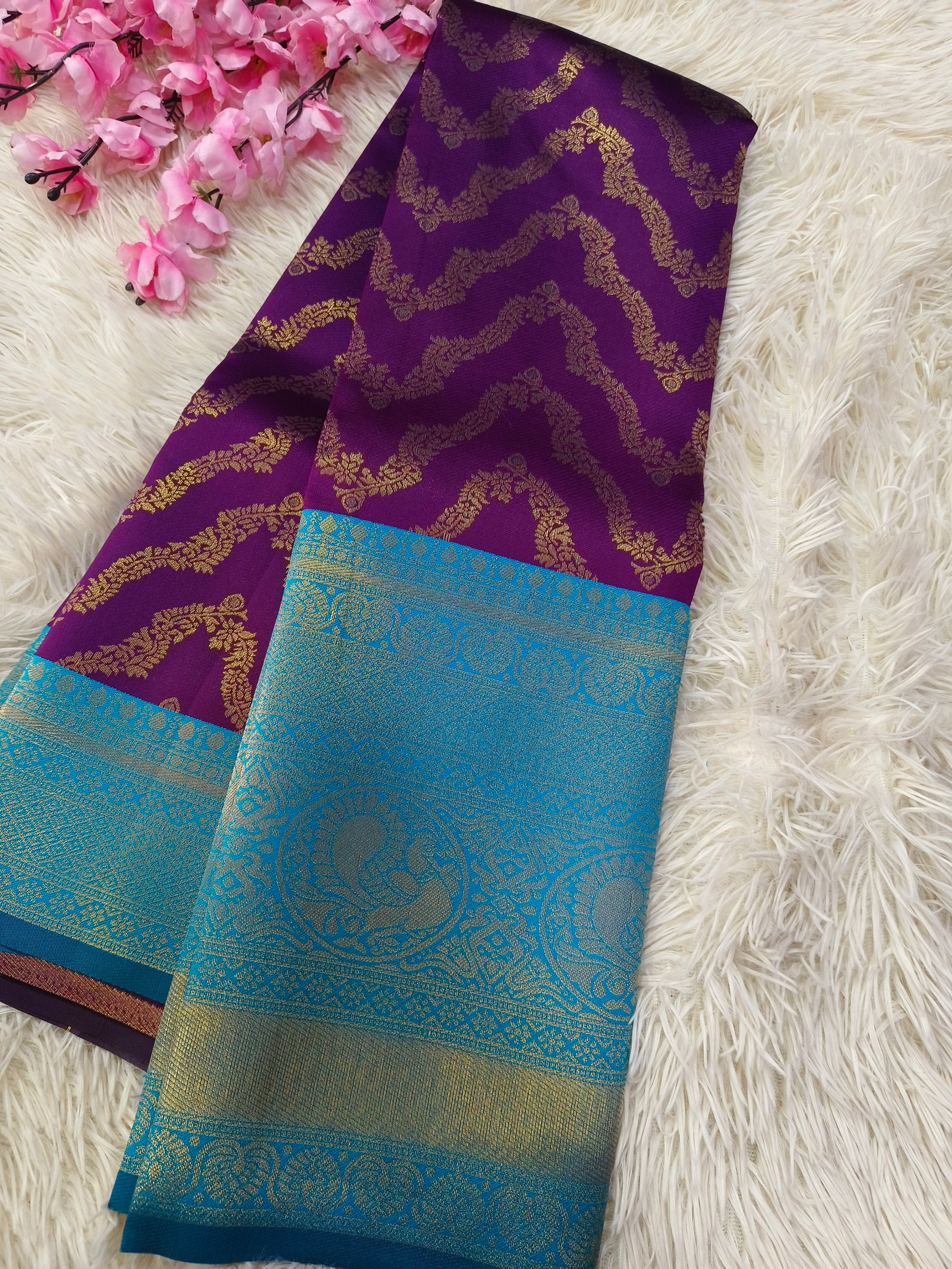Elegant bridal Saree featuring a rich silk finish with delicate zari zik zak lines on the body. The pallu is adorned with traditional woven motifs and a shimmering golden zari base, adding a regal charm. Perfect for festive and traditional occasions.