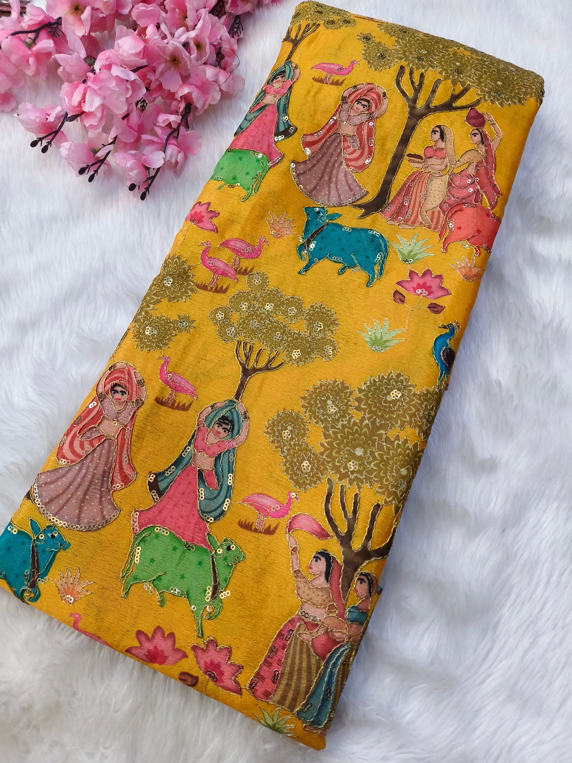 Add a pop of color to your wardrobe with this vibrant Raw blouse fabric! Featuring a rich royal purple base, it is adorned with bold multicolor floral and paisley motifs in shades of orange, pink, green, and gold. The intricate detailing with subtle shimmer adds a festive charm, making it perfect for pairing with sarees, lehengas, or skirts for special occasions and traditional celebrations