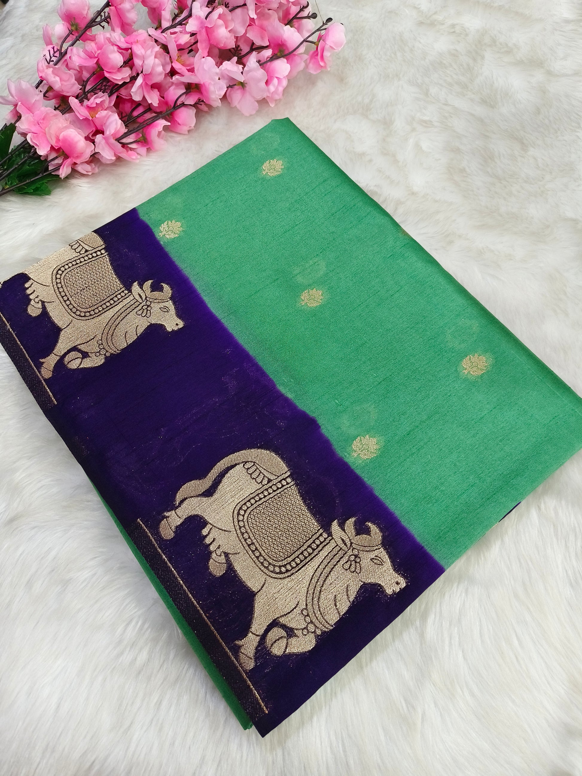 Elevate your wardrobe with this beautiful silk blend saree with gold zari with cow border