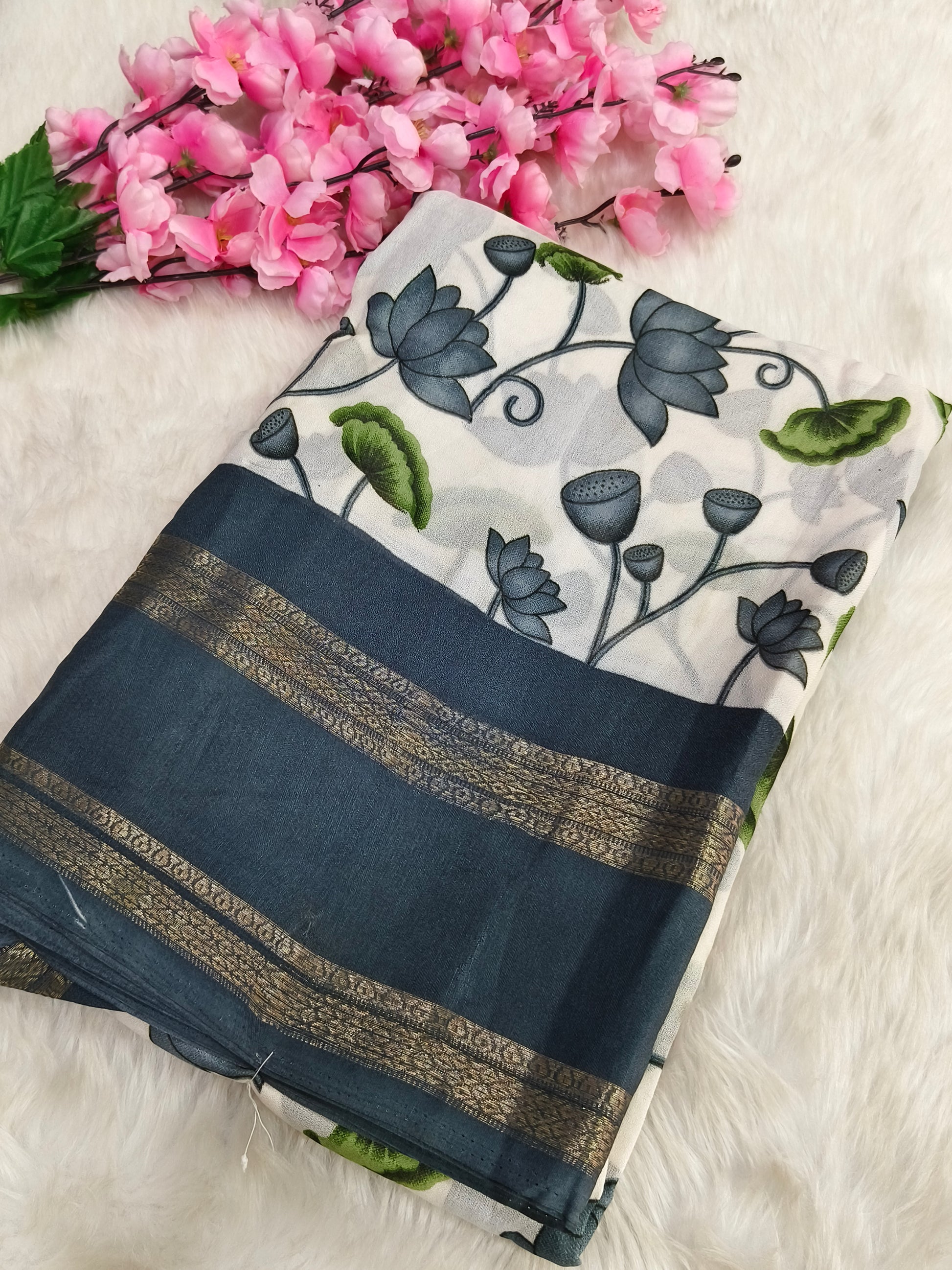 Beautiful moss chiffon saree with Kalamkari of floral design with bentex border