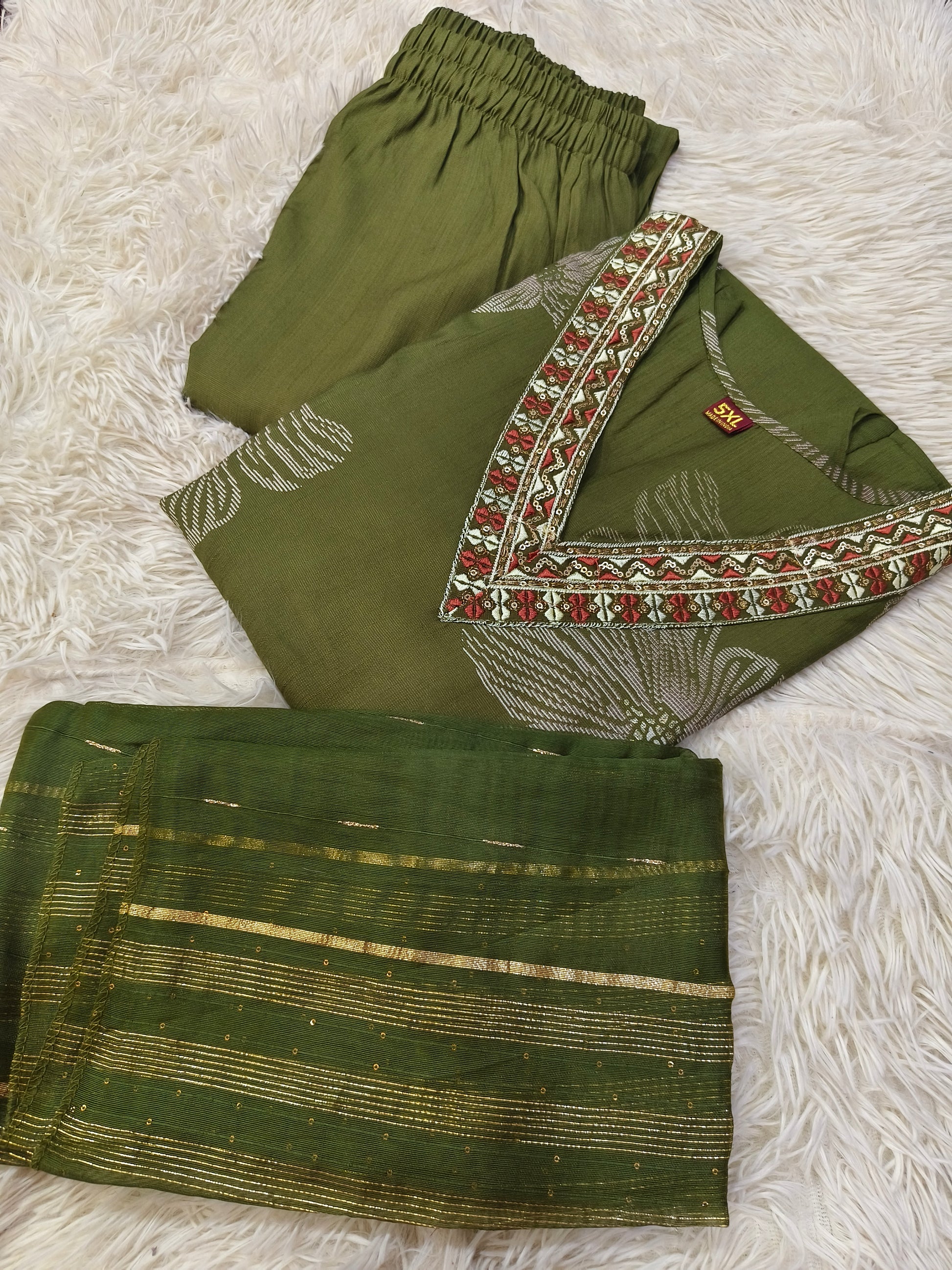 Vatican silk with Elegant designer 3pcs suits with floral printed design with beautiful neck work.