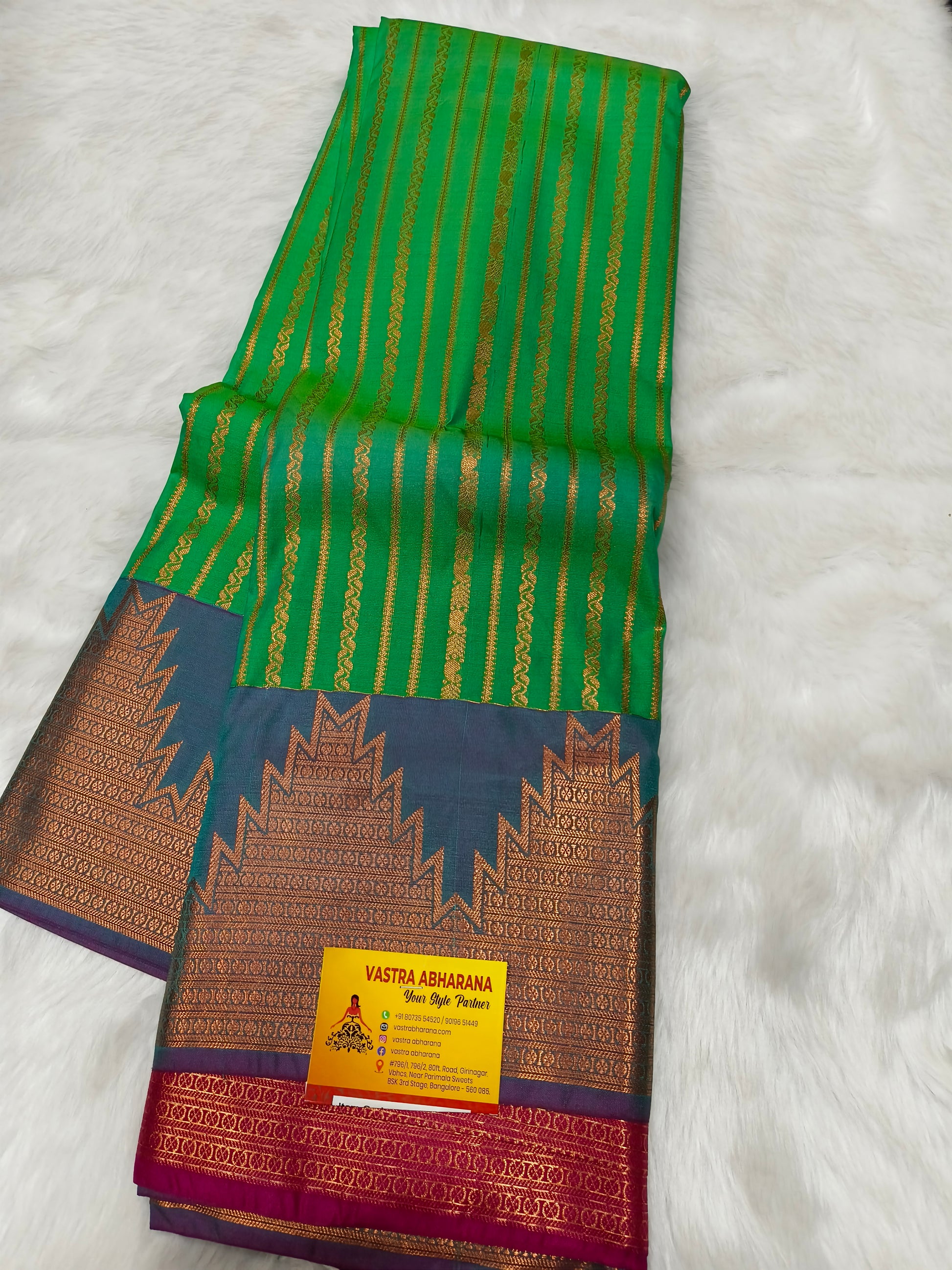 Traditional rich kanjivaram semi silk saree with weaving Comes with contrast zari woven pallu.