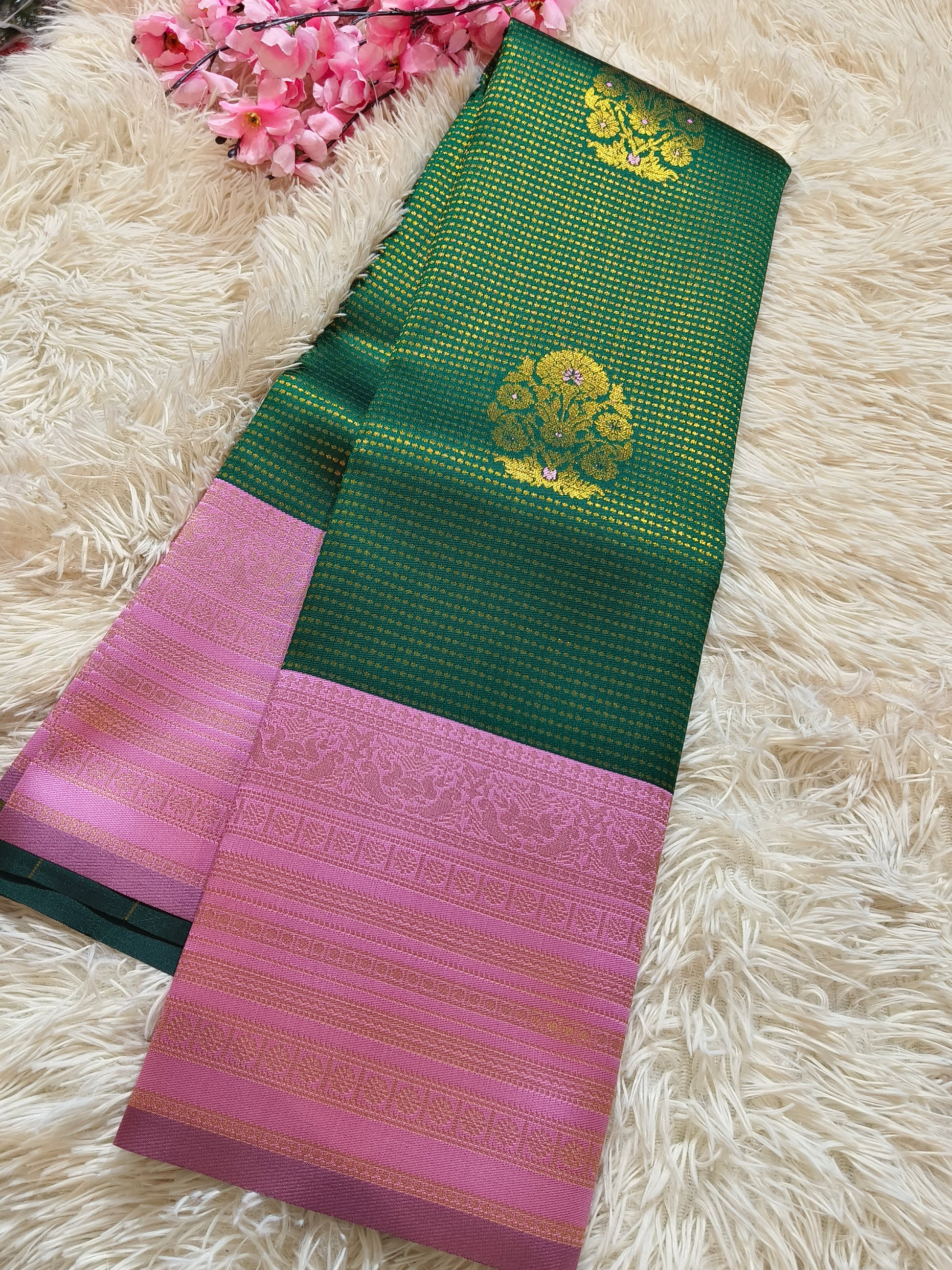 Green With Light Pink Semi Kanchi Pattu silk saree