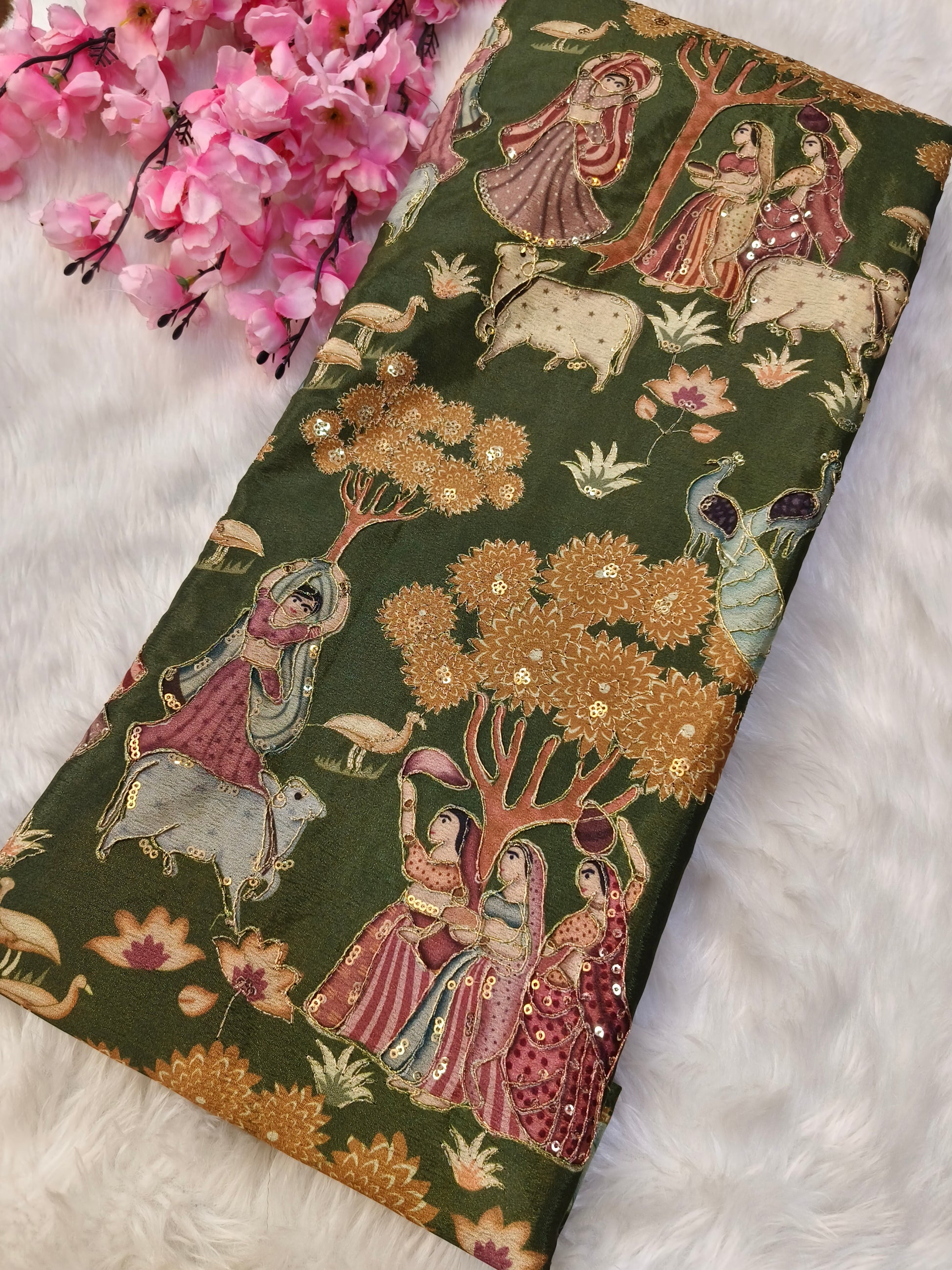Add a pop of color to your wardrobe with this vibrant Raw blouse fabric! Featuring a rich royal purple base, it is adorned with bold multicolor floral and paisley motifs in shades of orange, pink, green, and gold. The intricate detailing with subtle shimmer adds a festive charm, making it perfect for pairing with sarees, lehengas, or skirts for special occasions and traditional celebrations