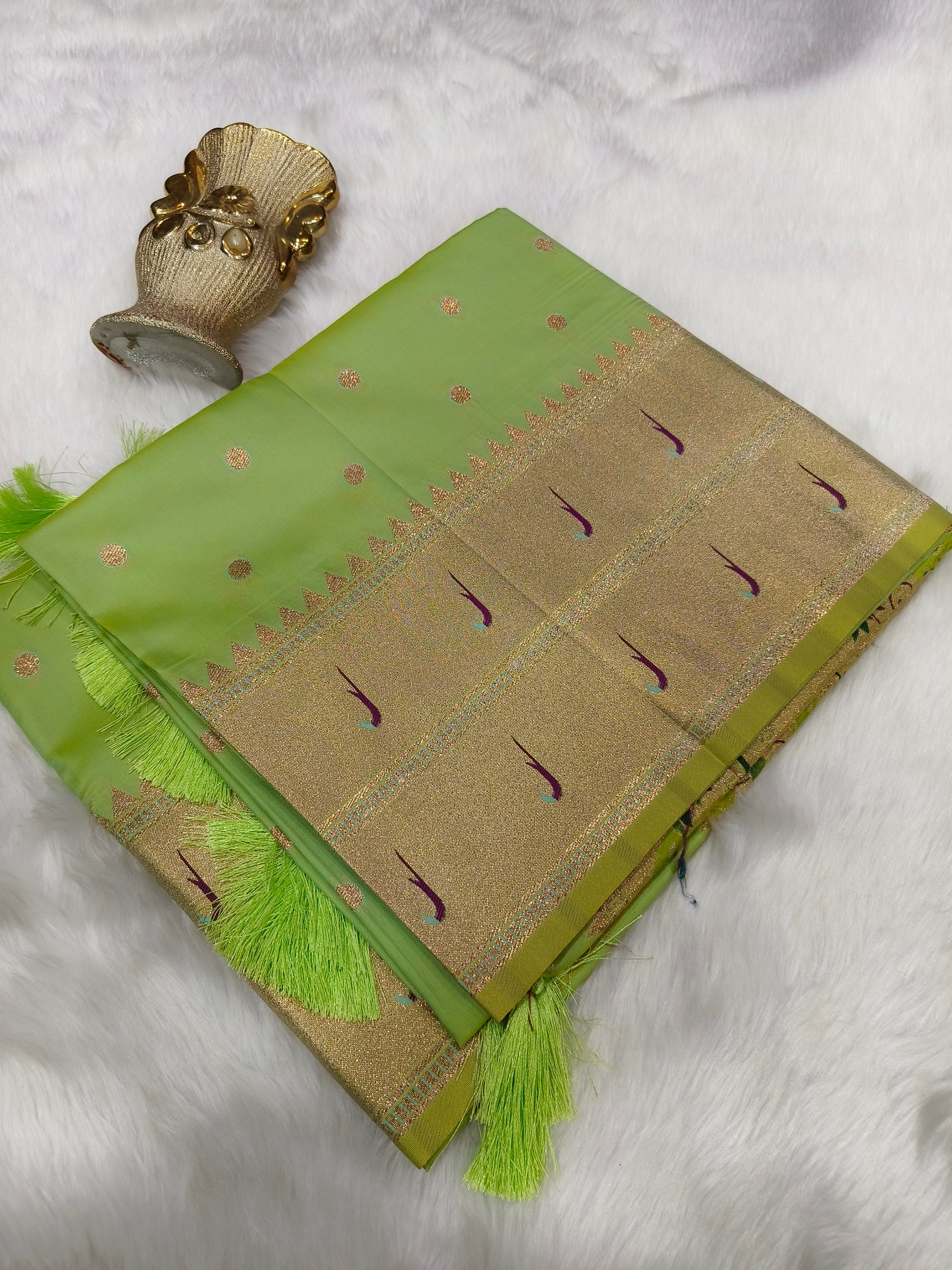 Elegant Paithani Saree featuring a rich silk finish with delicate zari polka dots on the body. The pallu is adorned with traditional woven motifs and a shimmering golden zari base, adding a regal charm. Perfect for festive and traditional occasions.