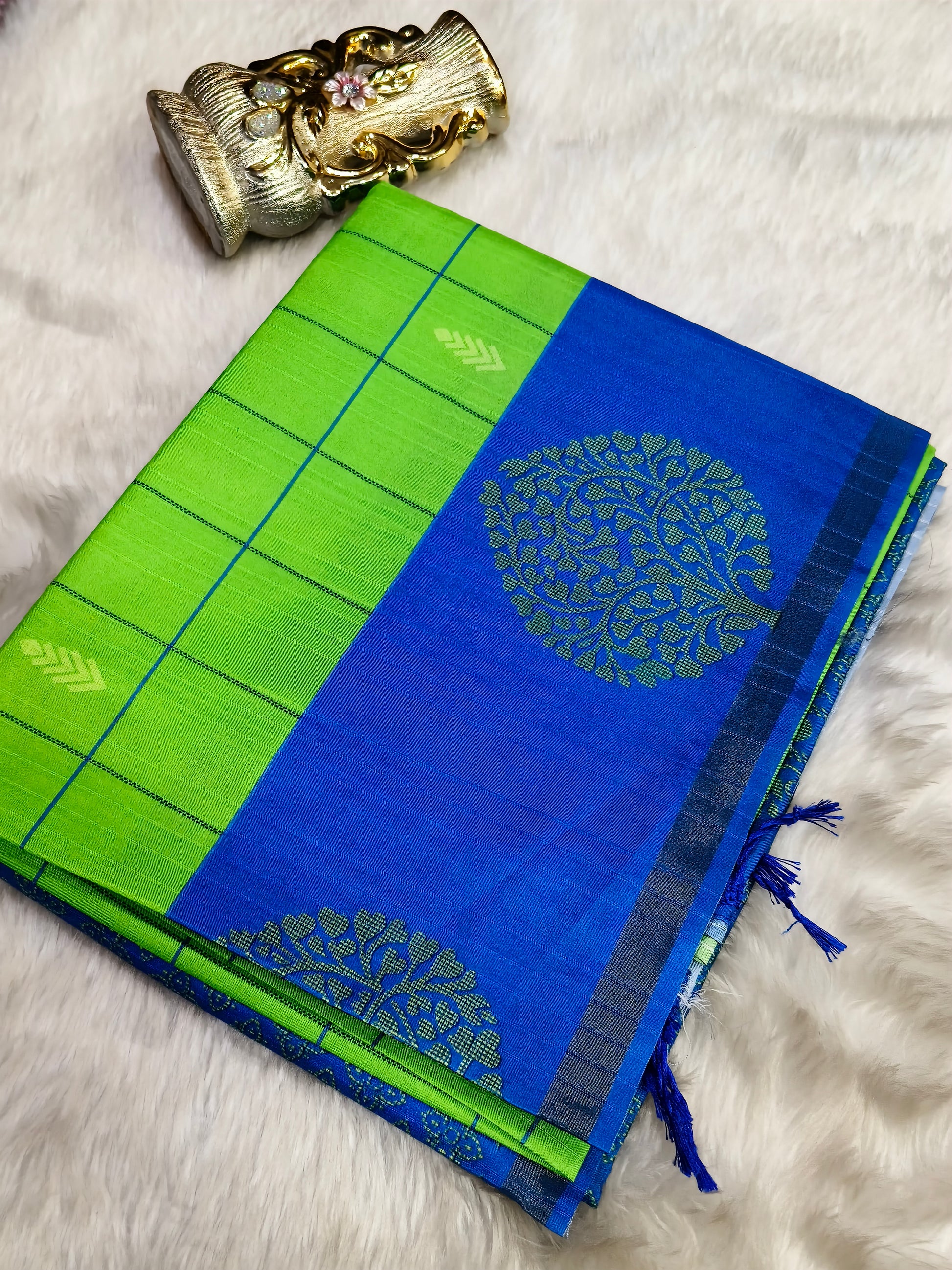 Parrot Green with Royal blue Soft tussar silk saree