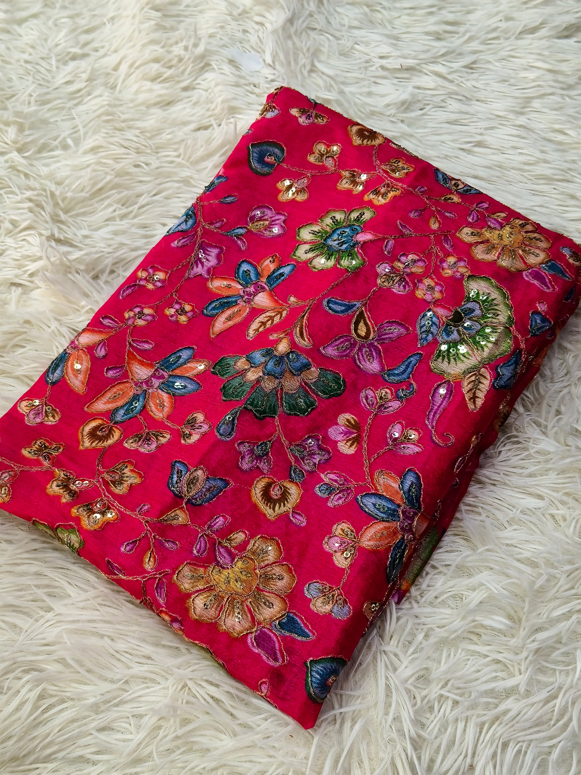 Add a pop of color to your wardrobe with this vibrant Raw blouse fabric! Featuring a rich royal purple base, it is adorned with bold multicolor floral and paisley motifs in shades of orange, pink, green, and gold. The intricate detailing with subtle shimmer adds a festive charm, making it perfect for pairing with sarees, lehengas, or skirts for special occasions and traditional celebrations