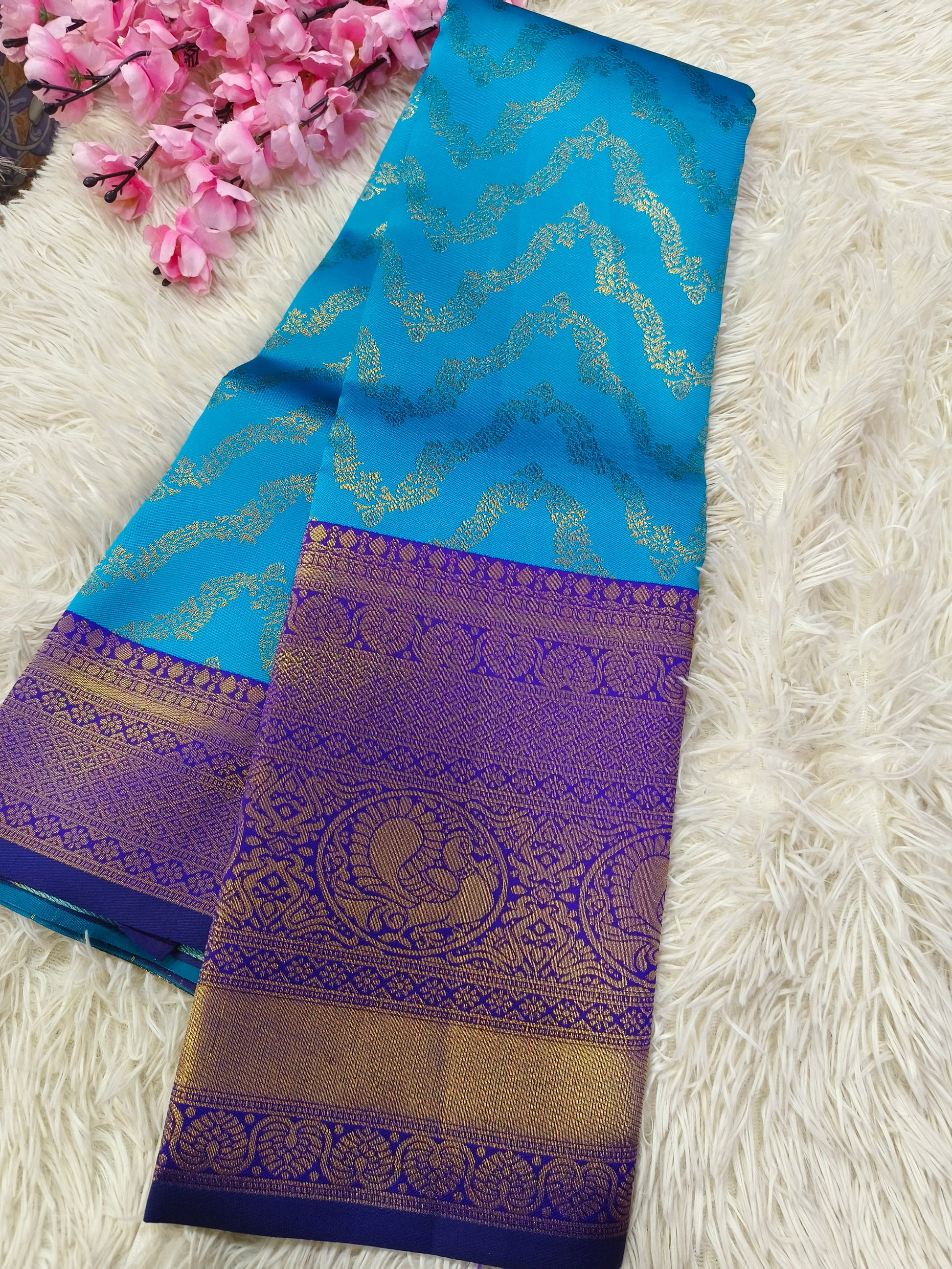 Elegant bridal Saree featuring a rich silk finish with delicate zari zik zak lines on the body. The pallu is adorned with traditional woven motifs and a shimmering golden zari base, adding a regal charm. Perfect for festive and traditional occasions.