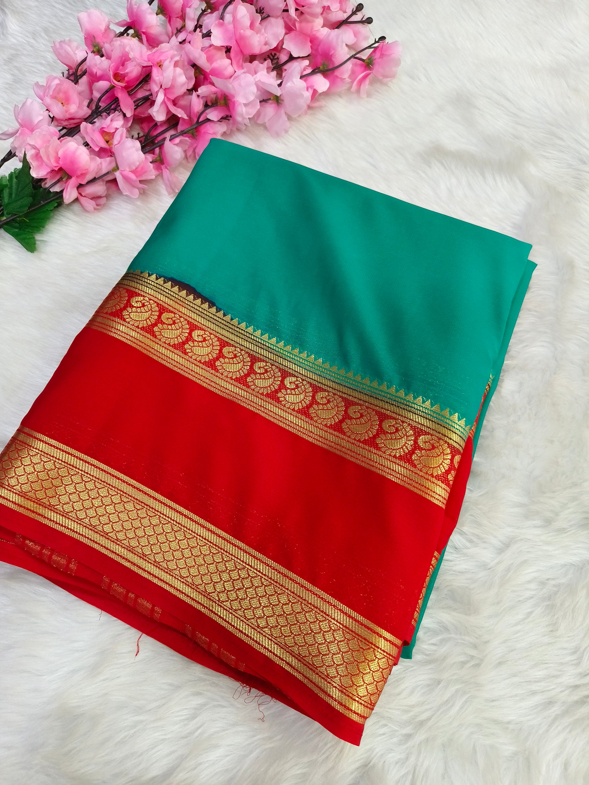 Sea green with red semi Mysore crepe silk saree