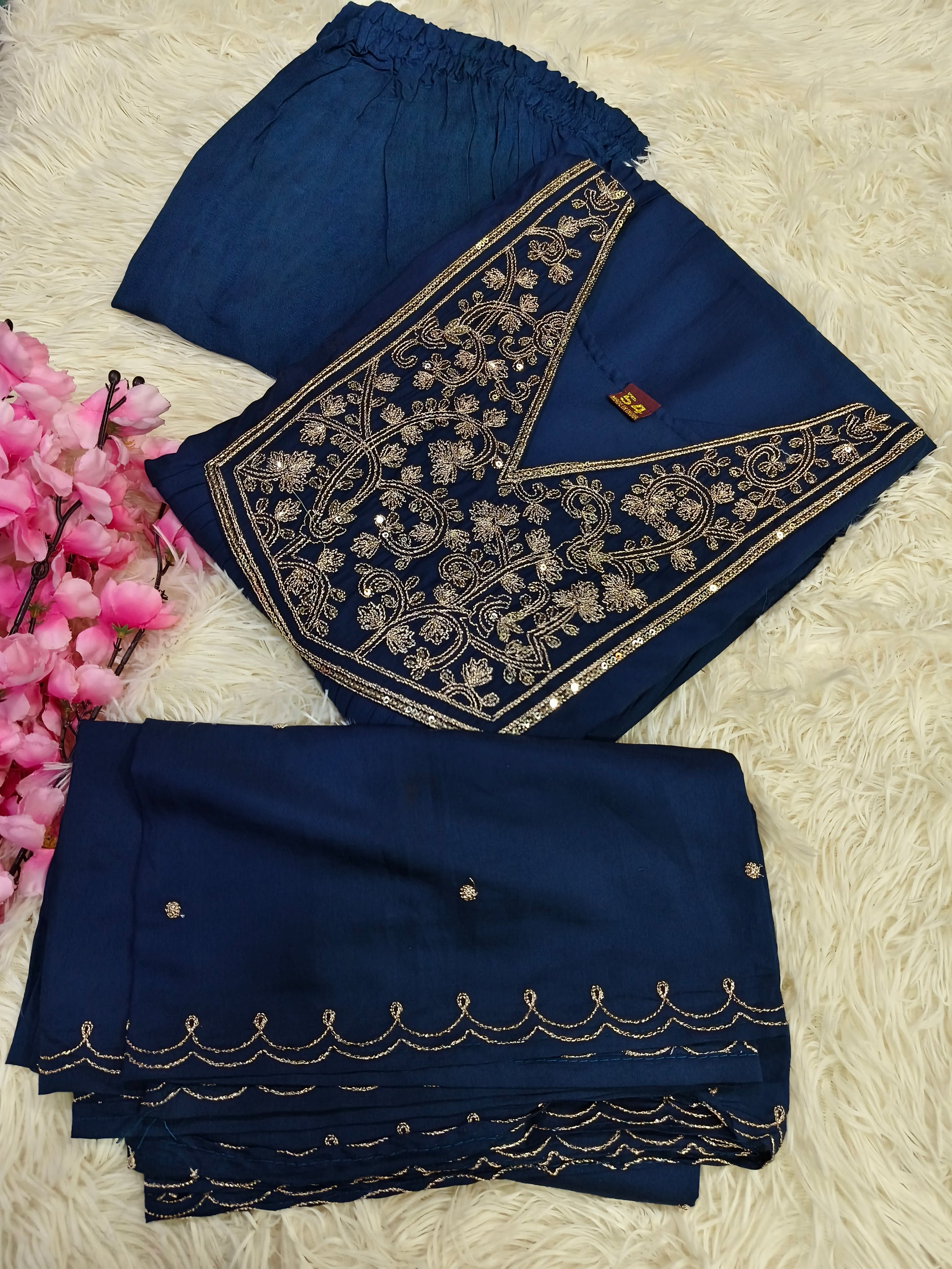 Elegant designer 3pcs suits with beautiful neck work.