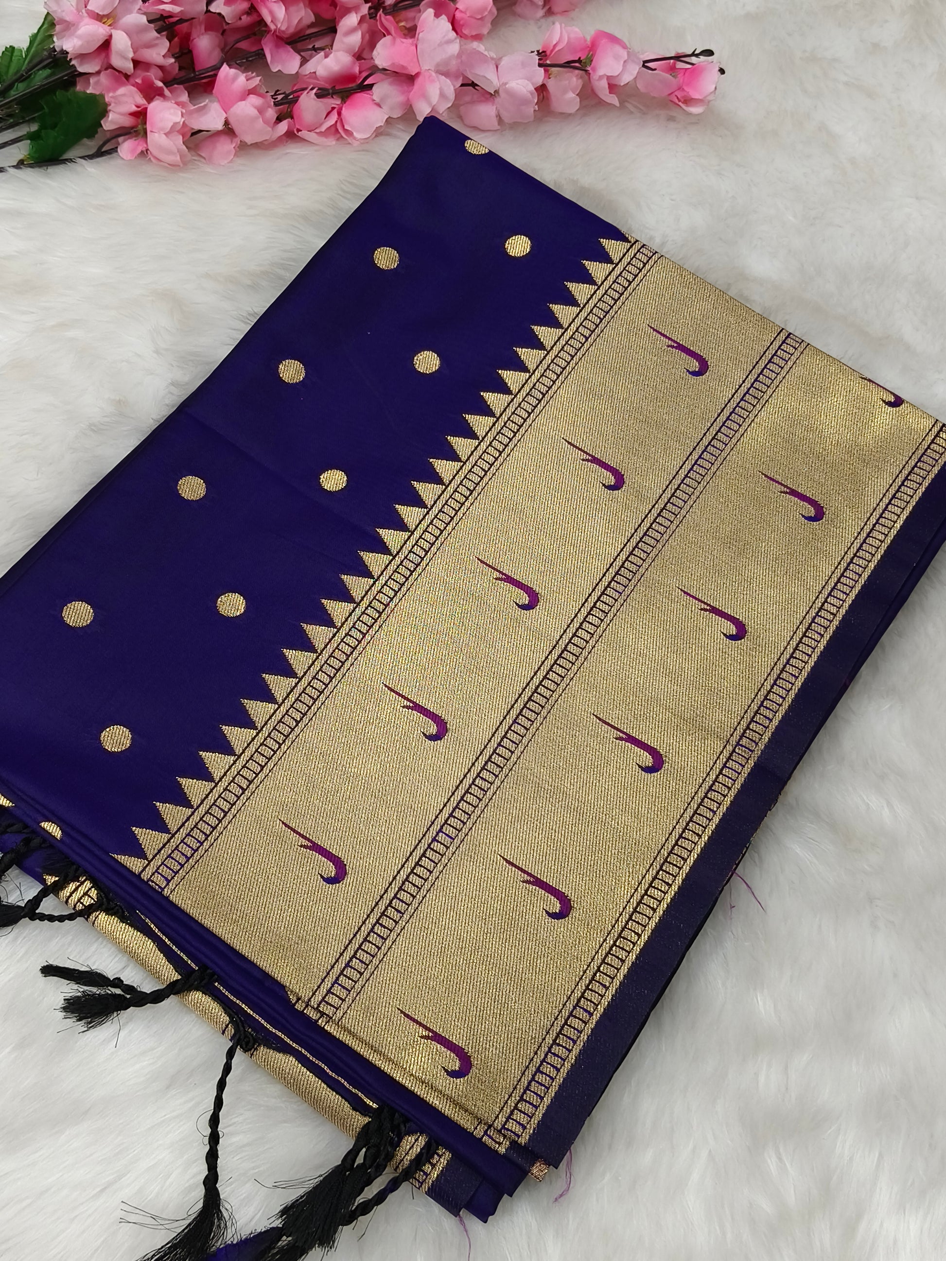 Elegant Paithani Saree featuring a rich silk finish with delicate zari polka dots on the body. The pallu is adorned with traditional woven motifs and a shimmering golden zari base, adding a regal charm. Perfect for festive and traditional occasions.